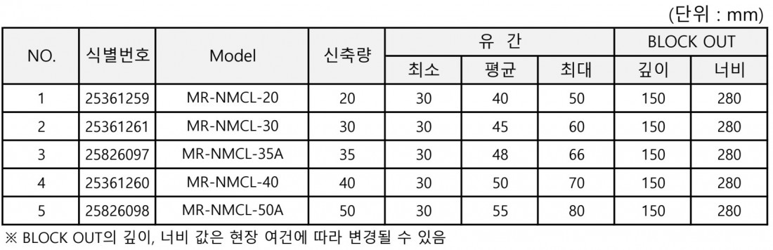 뉴모노셀형 본문 품목사진 품목정보 상세 정보 뉴모노셀형 종방향 교량이음장치(MR-NMCL)에 대한 특징은? · 상판이 강재로 제작되어 내구성 우수 · 모든 교량 형식에 시공 가능 · 설치 시 온도 및 현장 여건에 맞게 프리셋팅이 가능하여 설치가 용이함 · 상판이 강재로 제작되어 내구성 우수 · 1.8M로 제작되어 부분 보수 가능 · 분절 시공이 가능하여 전면 통제하지 않고 부분 보수가 가능하여 시간 및 비용 절감 목록