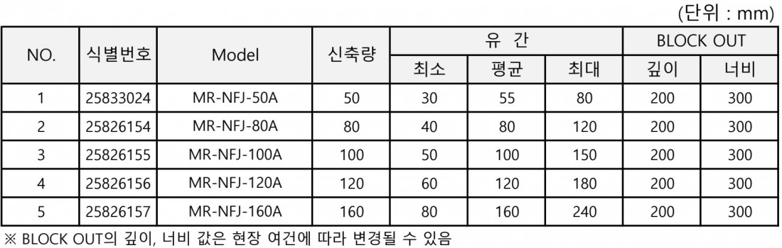 본문 품목사진 품목정보 상세 정보 뉴핑거형 교량이음장치(MR-NFJ)에 대한 특징은? · 이격 공간이 좁아 주행 시 소음이 적고 차륜 충격 및 마모성에 대한 내구성 우수 · 설치 시 온도 및 현장 여건에 맞게 프리셋팅이 가능하여 설치가 용이함 · 상판이 강재로 제작되어 내구성 우수 · 합성 고무를 사용하여 내오존성, 내한성 내구성 우수 · 1.8M로 제작되어 부분 보수 가능 · 분절 시공이 가능하여 전면 통제하지 않고 부분 보수가 가능하여 시간 및 비용 절감 목록