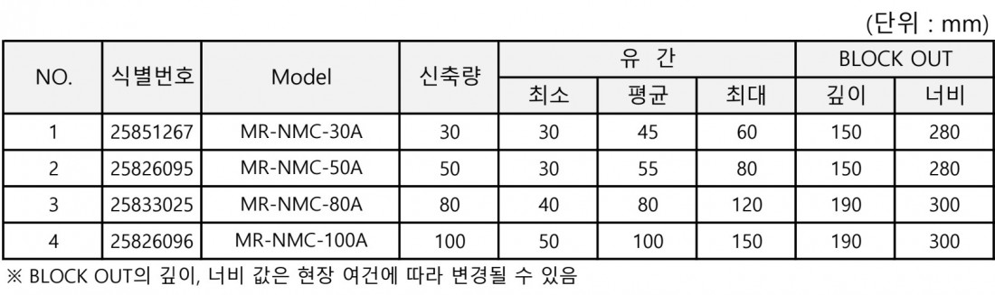 뉴모노셀형 본문 품목사진 품목정보 상세 정보 뉴모노셀형 횡방향 교량이음장치(MR-NMC)에 대한 특징은? · 싱판이 물결무늬로 제작되어 주행성 우수 · 설치 시 온도 및 현장 여건에 맞게 프리셋팅이 가능하여 설치가 용이함 · 상판이 강재로 제작되어 내구성 우수 · 1.8M로 제작되어 부분 보수 가능 · 분절 시공이 가능하여 전면 통제하지 않고 부분 보수가 가능하여 시간 및 비용 절감 목록