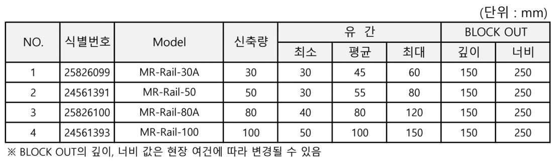 레일형 본문 품목사진 품목정보 상세 정보 레일형 교량이음장치(MR-RAIL)에 대한 특징은? · 상판이 강재로 제작되어 내구성 우수 · 모든 교량 형식에 시공 가능 · 구조가 단순하여 시공이 용이하고, 경제성 우수 ㆍ교량 길이에 맞춰 일체형 시공이 가능하여 배수성 우수 · 일체형 고무재로 방수성이 뛰어남 목록